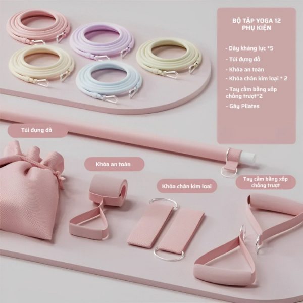 Đây là sản phẩm 2 trong 1, kết hợp giữa thanh tập Pilates và dây kháng lực đàn hồi cao, giúp người dùng có thể thực hiện hàng chục bài tập khác nhau, tác động toàn diện đến các nhóm cơ: tay, vai, ngực, lưng, bụng, mông và đùi.