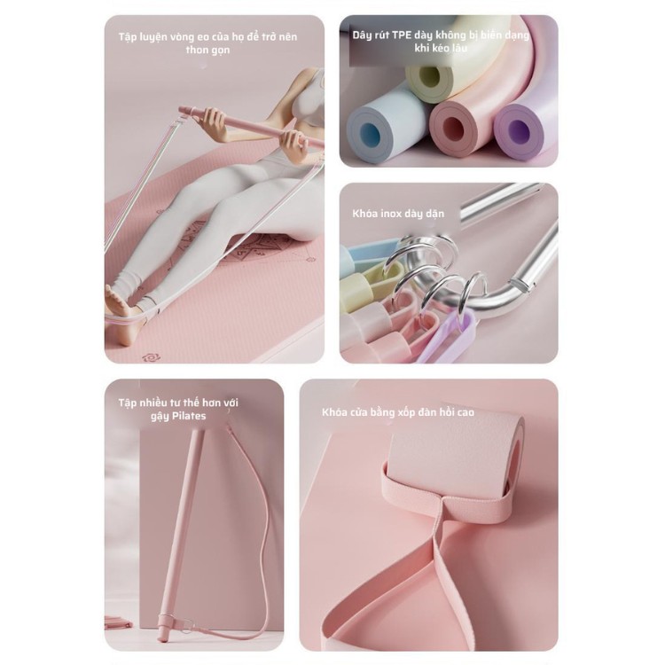 Đây là sản phẩm 2 trong 1, kết hợp giữa thanh tập Pilates và dây kháng lực đàn hồi cao, giúp người dùng có thể thực hiện hàng chục bài tập khác nhau, tác động toàn diện đến các nhóm cơ: tay, vai, ngực, lưng, bụng, mông và đùi.